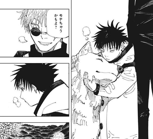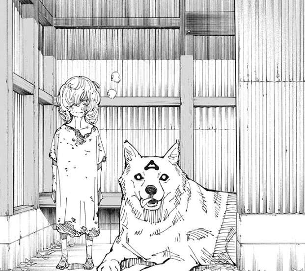その白い犬は伏黒の白い玉犬で、幼い頃の伏黒が来栖を助けたようです。この時、来栖は五条と一緒にいる幼い頃の伏黒を目撃していたようです。