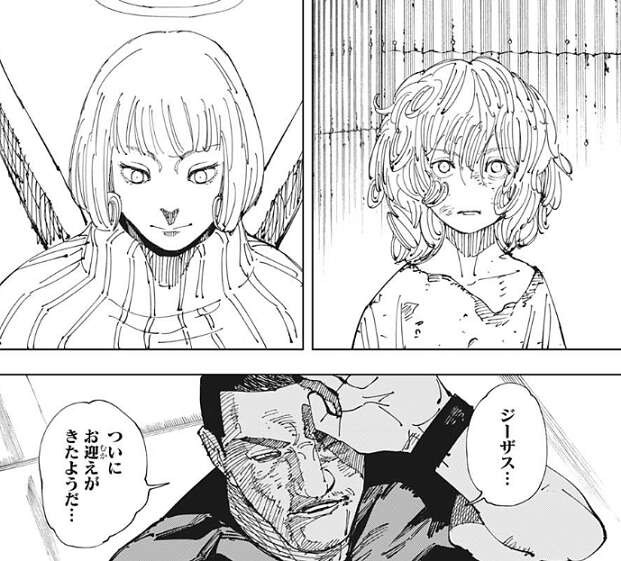 軍人の情報から、羂索が新エネルギーを餌に非術師の軍隊を結界(コロニー)に招き、呪霊に贄として捧げるつもりと分かり、虎杖は非術師の軍人を助けよう、と皆に言います。髙羽は自分達を拉致して体をイジくろうとした連中を助けることに乗り気ではありませんが、伏黒は放っておいたら“慣らし”が済み、この国の人達が天元と団子になるかもしれない、と虎杖に同調します。しかし、ここで来栖と共生している天使が虎杖の軍人を助けようという考えを拒否します。