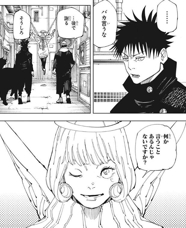 虎杖の言葉を聞き、伏黒は、……バカ言うな、と注意します。…後で謝る、と言う虎杖に、そうしろ、と伏黒は言いますが、そこに来栖が空から下りてきます。来栖は、何か言うことあるんじゃないですか?と、ウィンクしながら虎杖に話しかけます。