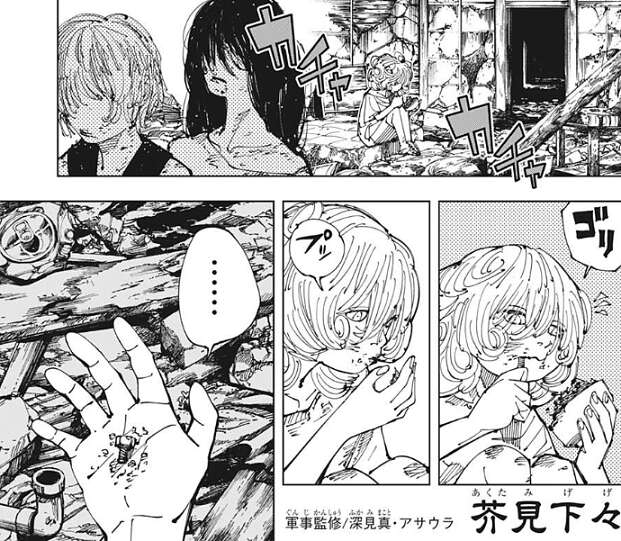幼い頃の来栖華が廃屋で食事をしている場面ですが、食べているのは土でした。呪霊に食事として土を渡されていて、土の中にはネジが混ざっている事もあったようです。