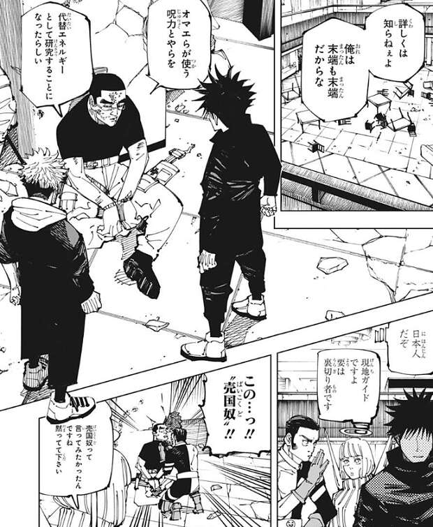 場面は変わって虎杖達が軍人を尋問していて、軍人は呪力を代替エネルギーとして研究する為に結界(コロニー)に潜入したことを話しています。この軍人は日本人で、現地ガイドのようですが、来栖から裏切り者と教えられて髙羽が怒っています。しかし、来栖から“売国奴”って言ってみたかったんですね、黙って下さい、とツッコまれています。