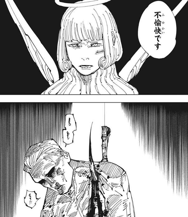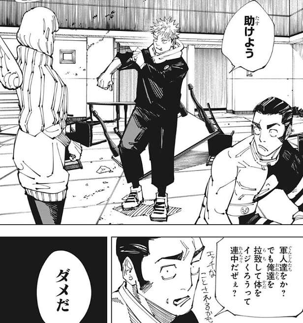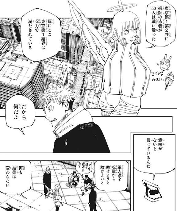 天使は、東京第1第2は共に術師のプレイヤーが50人は戦いで散っていて、既にここ東京第1結界(コロニー)は呪力で満たされているので、軍人を助けても意味がないと言います。しかし、天使の言ったことを聞いても、だから何だよ、と虎杖は言い、あくまで軍人を助けようとします。