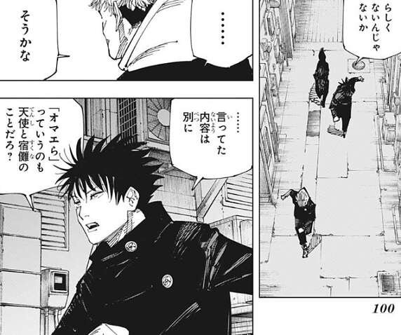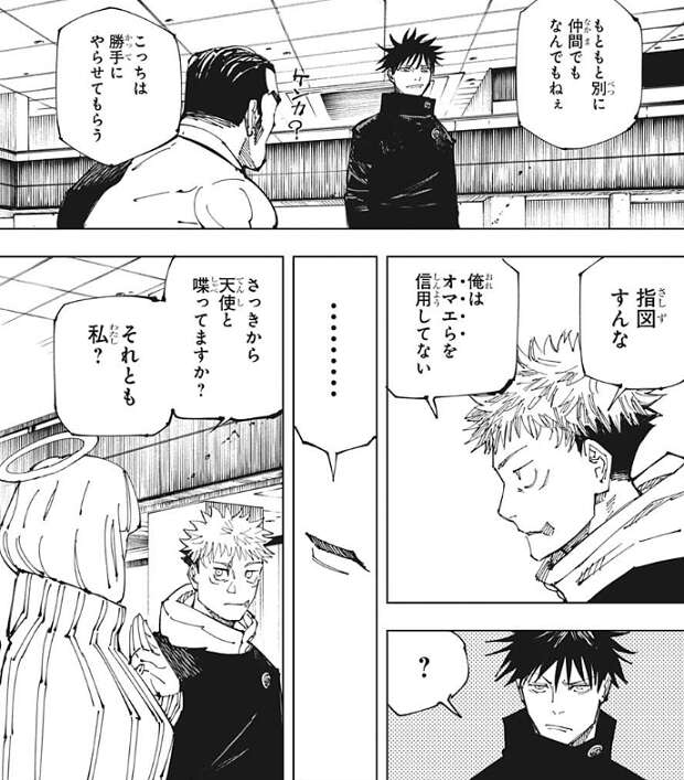 虎杖と伏黒は来栖や髙羽と別れて、軍人を助けに走り出したようですが、その途中で、虎杖にらしくないと伏黒が話しかけています。「オマエら」っていうのも、天使と宿儺のことだろ?と、伏黒は虎杖に確認します。