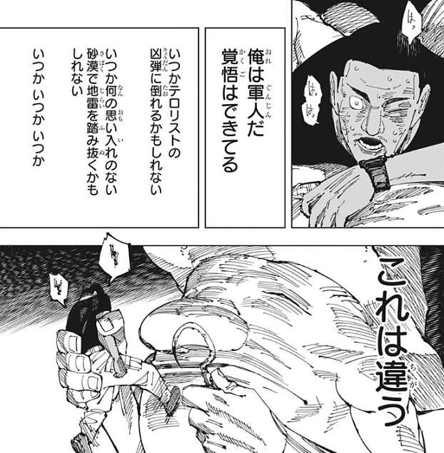 呪霊はさらに別の生きている軍人を餌にしようと、針を軍人に突き刺そうとします。軍人は、死ぬ覚悟はできていたようですが、これは違う、こんなのは嫌だ…!!!と、心の中でつぶやきます。すると、呪霊と軍人の頭上が急に光りだします。