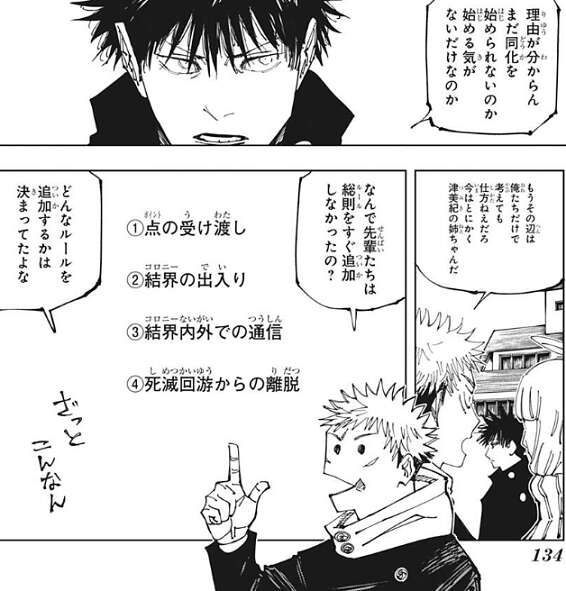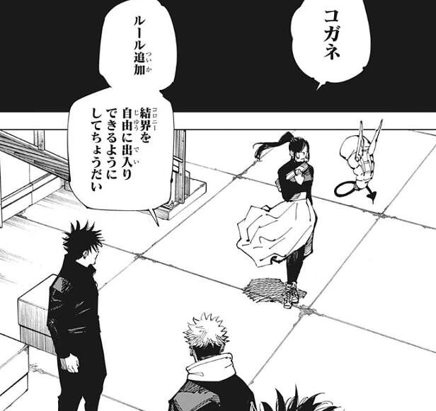 しかし、伏黒の抗議にはコガネは何も答えず、結局コガネが提案したルールが死滅回游のルール11として追加されます。