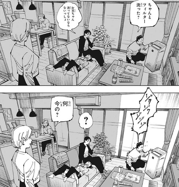 虎杖は天元が羂索に獲られたのになんで同化が始まらないのか、疑問に思い質問しますが、やはり理由は分からないようです。術師は多分呪力で同化を拒めるようですが、結界(コロニー)の外では少し当てられやすい人間が調子を崩しているだけで、基本的にいつもの日本のようです。羂索がまだ同化を始められないのか、始める気がないだけなのか、考えても仕方がないという事で、虎杖は伏黒の姉・津美紀を死滅回游から離脱させようと言います。そして、真希になんでルールをすぐ追加しなかったのか、虎杖は質問します。