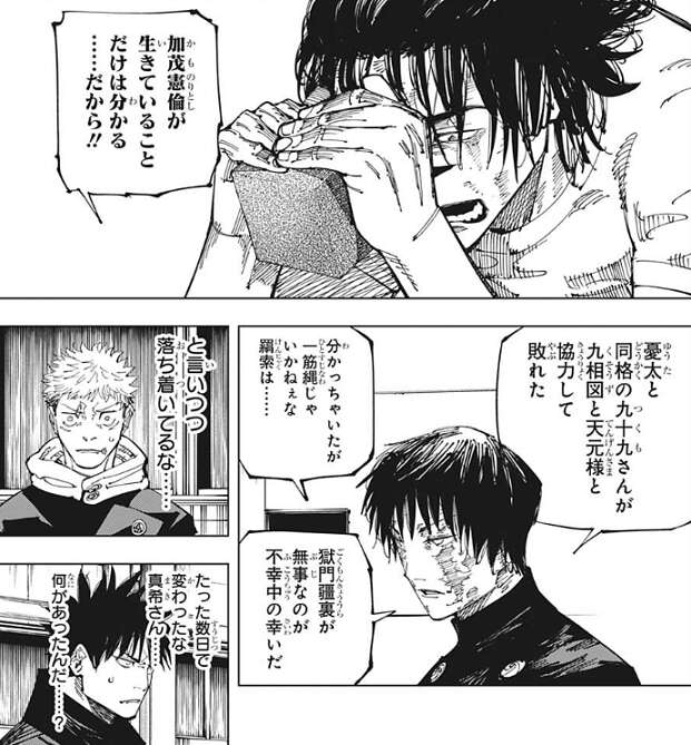 そして時間は16日の正午まで進み、真希と虎杖達が合流しています。真希は九十九と脹相、天元が協力して羂索と戦ったが敗れたことを虎杖達に説明しています。獄門疆裏は脹相が持っていて無事のようですが、九十九は死に天元が羂索に獲られた事を虎杖達に話すと、虎杖達はショックを受けます。