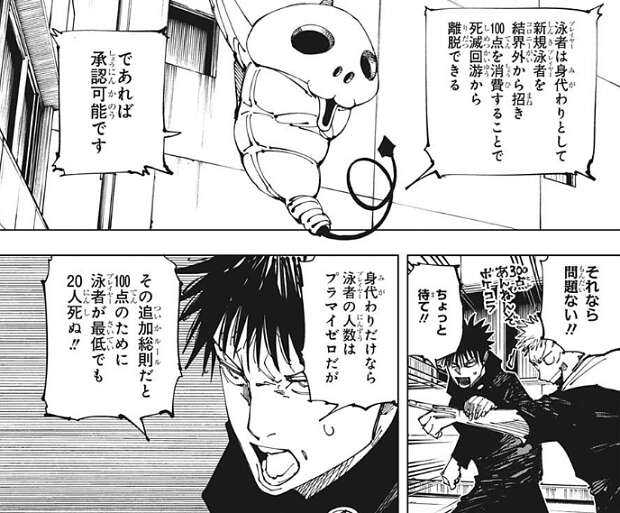 伏黒はコガネに、プレイヤーの死滅回游からの離脱を可能にするルールを追加しようとしますが、ルール7に抵触する、と却下されます。伏黒にとっては予想通りで、次にプレイヤーの身代わりとして新規プレイヤーを結界(コロニー)外から招くことで死滅回游から離脱できる、というルールを追加しようとしますが、これもコガネに却下されます。代わりにコガネから、プレイヤーは身代わりとして新規プレイヤーを結界(コロニー)外から招き100点を消費することで死滅回游から離脱できる、というルールであれば承認可能という提案をされます。しかし、その追加ルールだと100点のためにプレイヤーが最低でも20人が死に、明らかにそのルールの方がルール7の死滅回游の永続に抵触する、と伏黒が抗議します。