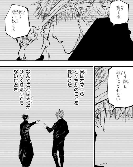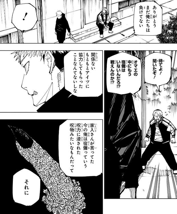 さらに場面は変わり、甘井が虎杖に謝っています。甘井は自分が嫌いで、死滅回游が始まった時もめちゃくちゃビビッて、強いやつの手下になりました。しかし、甘井は変わりたかった、あの時虎杖について行って一緒に戦いたかった、と言いますが、甘井にはその勇気がありませんでした。俺にないのはプライドなのかもしれない、と言ったところで話は終わり、とにかく謝りたかった、と甘井は虎杖に言います。虎杖は、オマエがどんなやつかとか正直知らん、しかし甘井のおかげで来栖が助かった、と言い虎杖は甘井にお礼を言います。虎杖は皆が集まっている場所へと行こうとしますが、甘井は、オマエの中にもう宿儺はいないんだろ!?戦えんのか!?と、虎杖に聞きます。虎杖は、関係ない、家入さんが言っていた、今の俺は宿儺っていう呪力に浸された呪物みたいなもんだって、と言います。