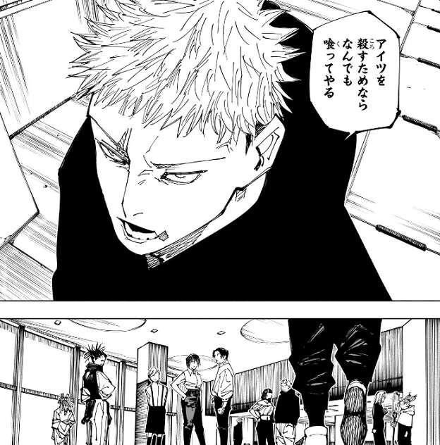 そして、アイツを殺すためならなんでも喰ってやる、と虎杖は険しい表情で言います。虎杖は乙骨や真希など皆が集まっている場所に行くと、伏黒を助ける案がいくつかある、と言います。乙骨にも伏黒を助ける案はあるようですが、どちらにしろ宿儺を戦闘不能にまで追い込んでからでないと話にならないようです。