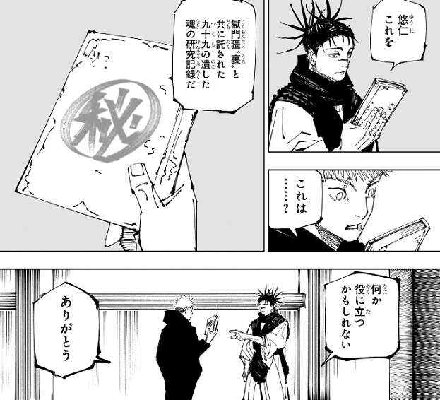 脹相は虎杖にある物を渡します。それは九十九が脹相に獄門疆“裏”と共に託した、魂の研究記録でした。何かの役に立つかもしれない、と脹相は虎杖に渡します。虎杖はお礼と共に兄弟たちの事も話そうとしますが、オマエの中で生きているのならそれでいい、と脹相は言います。