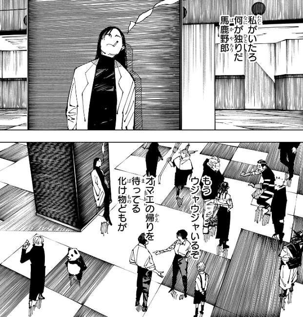 そして、私がいたろ、何が独りだ、馬鹿野郎、と家入は心の中で五条に怒ります。そして、ウジャウジャいるぞ、オマエの帰りを待ってる化け物どもが、とつぶやき、全員が集まっている場所を見ます。そして、帰ってこい五条、と家入は五条に語りかけます。