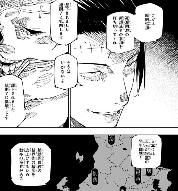羂索はコガネに死滅回游の新規プレイヤーの参加を打ち切るルールを追加してくれ、と言いますが、コガネはルール7に抵触すると言い、ルール追加を却下します。ここで羂索が、日本には天元が呪霊の抑制と、補助監督役の結界術の精度を底上げするための数多の浄界(より優れた結界)があり、さらに要となる4つの浄界がある、という話します。皇居を中心とした浄界、高専地下の薨星宮の浄界、京都山国御陵浄界、そして羂索が今いる日本を東西に分断する飛騨霊山浄界の4つの浄界です。