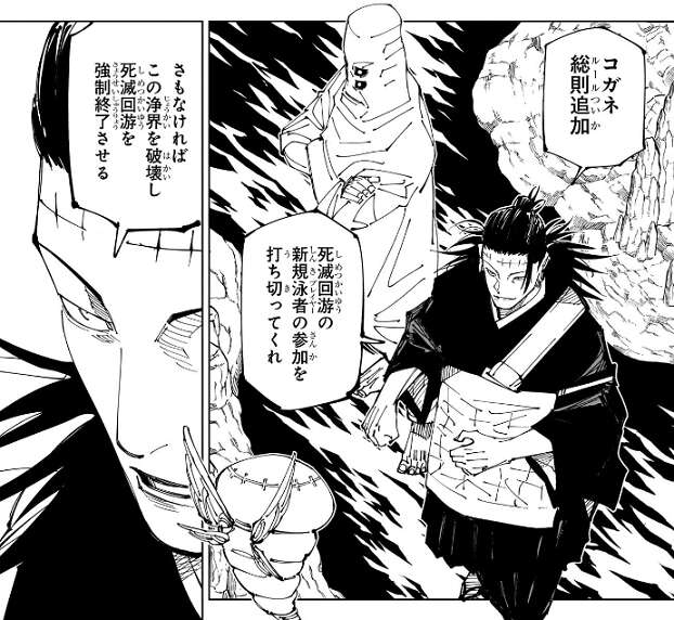 死滅回游はこの天元が作った浄界をベースにした梵界(浄界より優れた結界)で、死滅回游のゲームマスターは強いて言えば、羂索でもコガネでもなく天元に当たるそうです。死滅回游の後、天元がこれらの浄界を解き放てば死滅回游は終わり、羂索の思惑は全て水泡に帰していたそうですが、その場合浄界がなくなり多くの人間が死ぬ事態になっていました。天元は羂索でなく、彼等(おそらく虎杖達)が勝つ方に賭けて浄界を破壊しませんでした。そして、今天元は羂索の手中にあり、浄界を破壊することは容易い状況です。羂索は再び、コガネに死滅回游の新規プレイヤーの参加を打ち切るルール追加を依頼し、さもなければこの浄界を破壊し、死滅回游を強制終了する、とコガネを脅します。