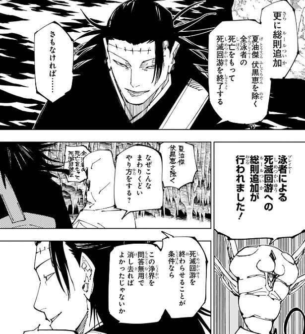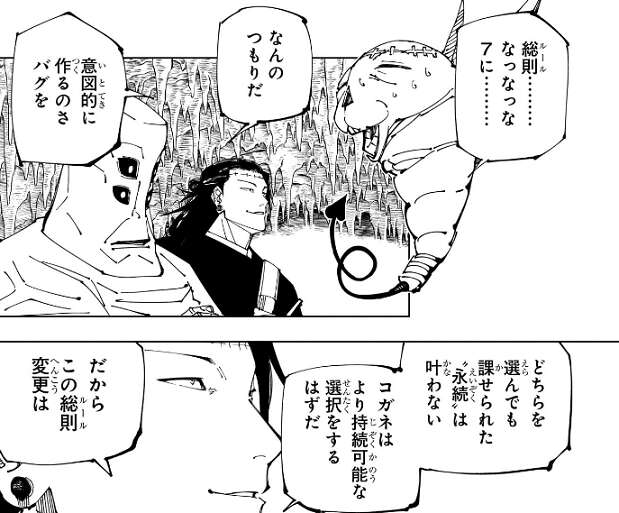 そして、さらに羂索は夏油傑、伏黒恵を除く全プレイヤーの死亡をもって死滅回游を終了する、というルール追加をコガネに依頼します。ここでもルールが追加されなければ浄界を破壊し、死滅回游を強制終了する、とコガネを脅そうとし、コガネはルール14としてルール追加を宣言します。天元はこんなまわりくどいやり方をしなくても浄界を問答無用で消し去れば、死滅回游を終わらせられたと言いますが、それでは天元との同化の慣らしに使った境界が消えてしまう、と羂索は言います。
