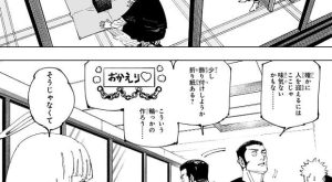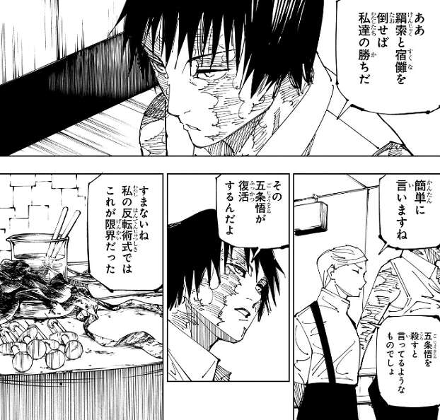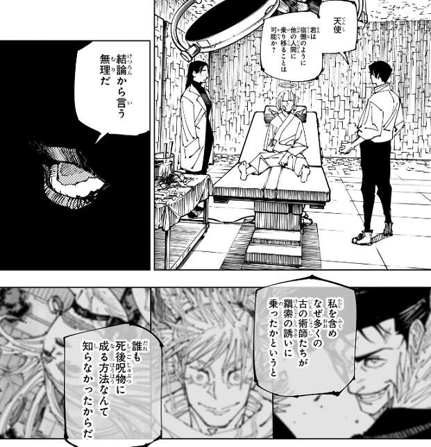 乙骨は天使に、宿儺のように他の人間に乗り移ることは可能か?と、質問しますが、天使は無理だと答えます。多くの古の術師たちが羂索の誘いに乗ったのは、死後呪物になる方法を知らなかったからで、それは今も同じでした。宿儺だけは、一度経験しただけで自らの魂を呪物として切り分ける方法を掴んだようで、宿儺のように自分の意思で他の人間に移る事は宿儺以外出来ないようです。天使は、私たちの仕事は五条悟の封印を解くまでだ、と言いますが、恵は……どうなるの………?と、来栖は独りつぶやきます。