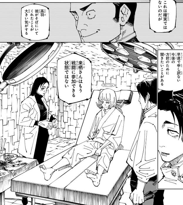 さらに場面は変わり、家入硝子、乙骨、来栖の三人がいる場面になります。家入は来栖を反転術式で治療し、何とか傷を治していました。甘井が術式で来栖を受け止めていた事と、髙羽がそばにいてくれた事が大きかったようで、本来は即死の状況でしたが、来栖は一命をとりとめていました。その後、家入がいる場所に運ばれて、反転術式で治療してもらったようです。しかし、来栖は見た目では傷は治ったように見えますが、もう戦闘に参加できる状況ではないようです。