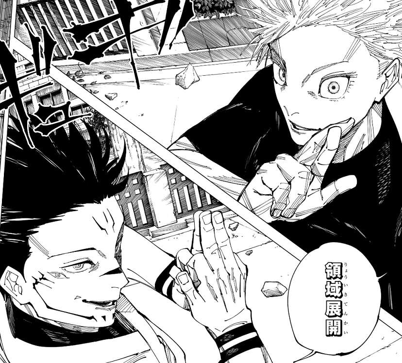2人の領域展開は互角で、五条の結界内では対になる2人の必中命令が重複し打ち消し合います。お互いが領域を展開した状態での戦闘では、どちらかが大きなダメージを負い領域が崩壊すれば、即座にどちらかの必中術式がどちらかを襲います。