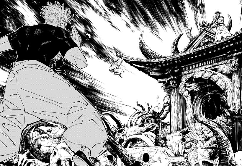 そして、宿儺が巨大な建物の上で不敵な笑みを浮かべていて、五条は首に斬撃をくらってしまいます。