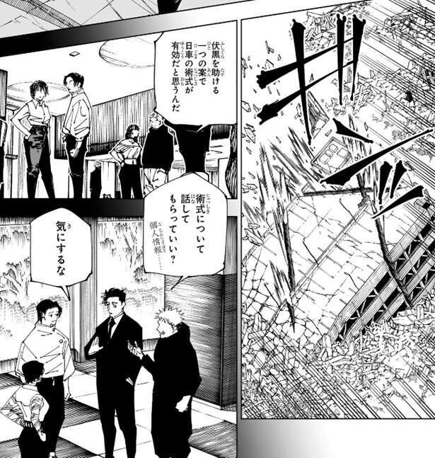 ここで場面は再び新宿決戦前の作戦会議に戻り、伏黒を助ける一つの案に日車の術式が有効なものがあるようです。虎杖が、術式について話してもらっていい?個人情報…、と日車に質問すると、気にするな、と日車は質問に答えます。
