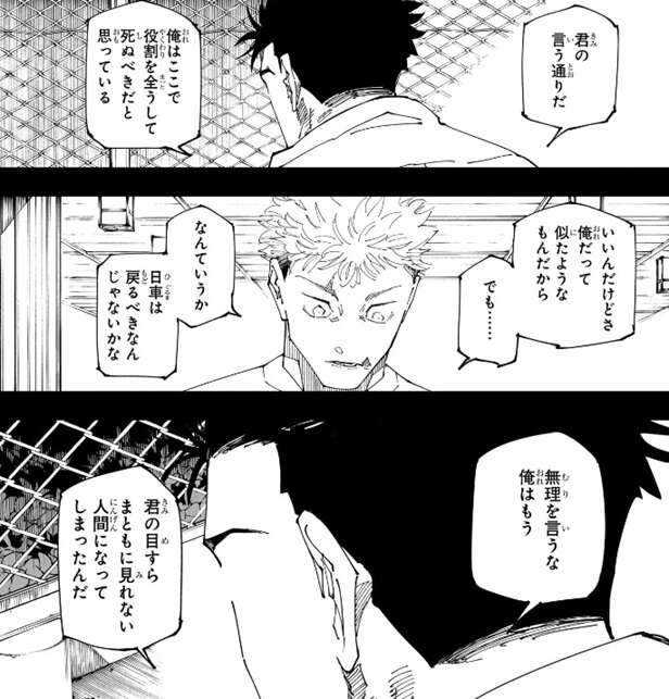 日車は、俺は法を見限り、また見限られた人間だ、最後は自分を罰するのは自分でありたい、と言い、日車は自分自身を罰して、最後はここで役割を全うして死ぬべき、と考えているようです。虎杖は、自分も似たようなもんだからいいんだけどさ、と言いつつ、日車は戻るべきなんじゃないかな、と日車に自分の思いを伝えます。しかし日車にとってそれは無理なようで、君の目すらまともに見れない人間になってしまったんだ、と虎杖に答えます。