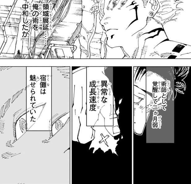 場面は新宿決戦へと戻り、日車は宿儺の術を受けていましたが、領域展延で中和していたことが判明します。日車が術師として覚醒したのは二か月弱前で、それを考えると領域展延を使えるのは異常な成長速度と言えます。