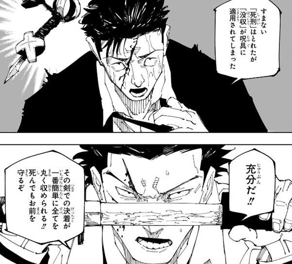 日車は日下部に、「死刑」はとれたが「没収」が術式でなく呪具に適用されてしまったことを伝えますが、日下部は充分だと言い、処刑人の剣での決着が一番簡単にすべてを丸く収められる!!と言います。そして、日下部は日車を死んでも守ると決意しますが、内心は、やっぱ俺ここで死ぬのかなぁ、と考えていて少し迷いがあるようです。