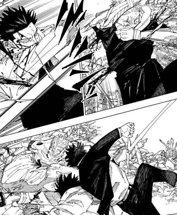 虎杖と日下部は、さらに宿儺に畳みかけようとしますが、宿儺が斬撃を出してくると、その攻撃を受け流すだけで精一杯です。しかしその直後、日車が日下部の後ろから現れて、処刑人の剣で宿儺を斬りつけようとしますが、宿儺は難なく処刑人の剣をかわします。そして宿儺は日車にパンチをくらわせると、日車の胸ぐらを掴んで日車を投げ飛ばします。