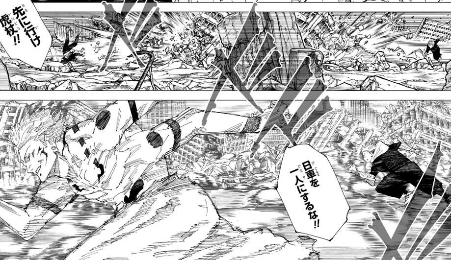 投げ飛ばした日車を追いかけて走る宿儺、日車を一人にさせないように虎杖も宿儺を追いかけて走り出します。日車を一人にするな!!と、叫んでいるのは多分日下部?だと思われますが、日下部は日車と連携して攻撃していたせいで体勢の崩しているのか、宿儺を走って追いかけられない状態のようです。