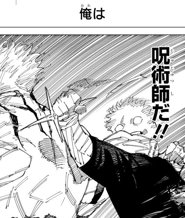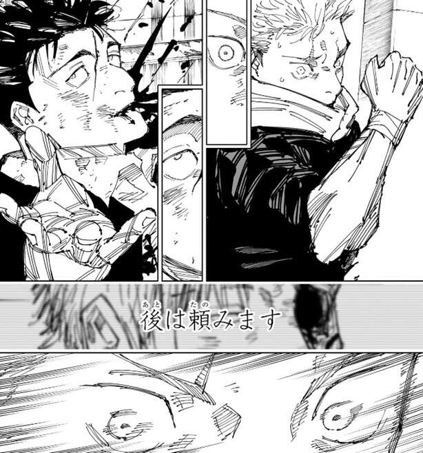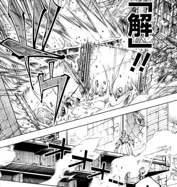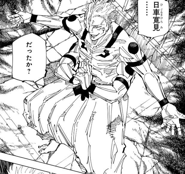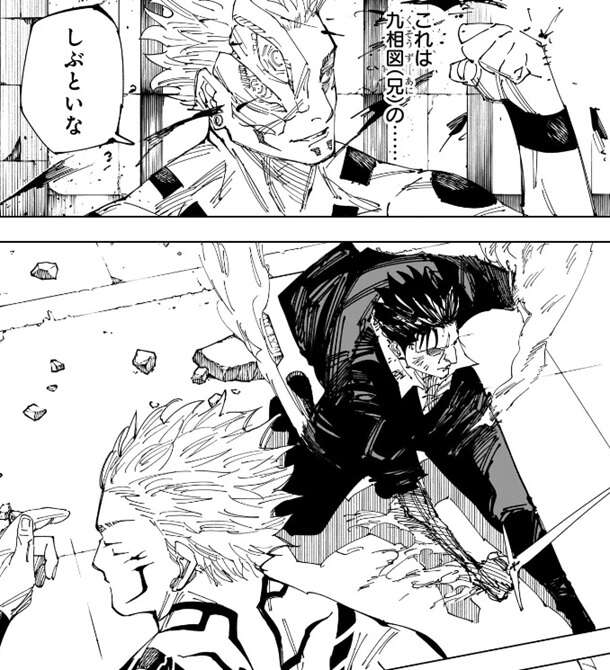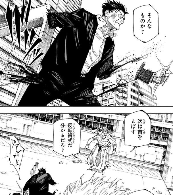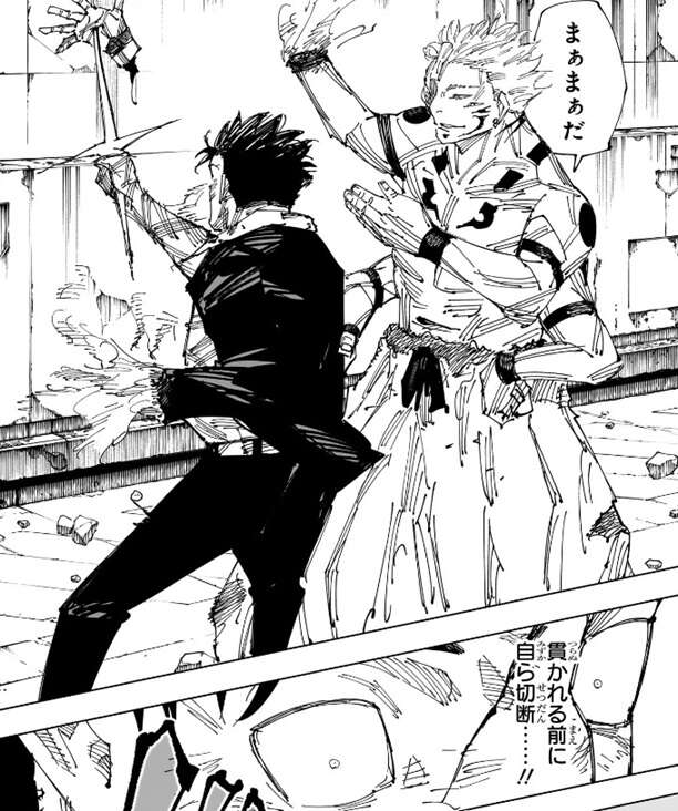 宿儺は日車の名前を確認しますが、2本の腕では既に掌印が結ばれていました。そこに、前回宿儺との速さ勝負でおいていかれた虎杖が追いつき、再び参戦します。