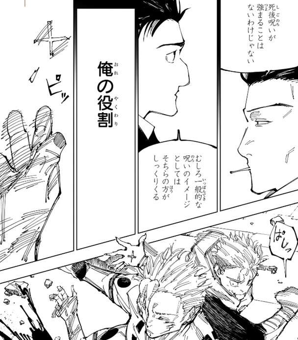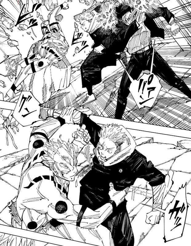 前回の記事はこちらです。日車、虎杖、日下部、脹相、猪野の五人で宿儺を攻撃、処刑人の剣で斬ろうとしますが、宿儺の速さに誰もついていけません。