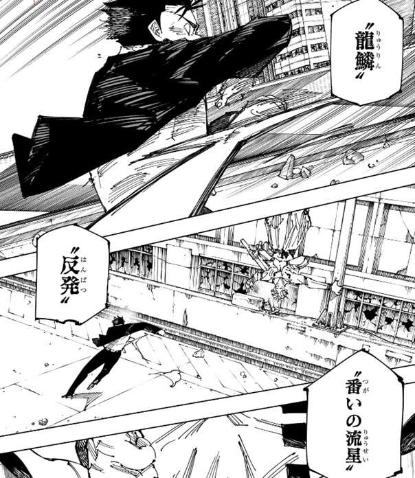 それでも日車は処刑人の剣で攻撃しますが、宿儺は2本の腕で掌印を結び、“龍鱗”“反発”“番いの流星”と呪詞を唱えると世界を断つ斬撃を放ちます。