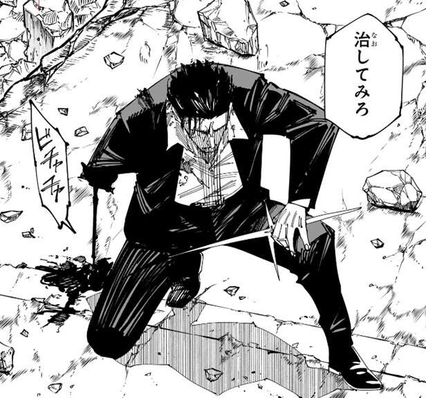 日車は斬撃をくらって右腕が斬り落とされていましたが、宿儺は反転術式で右腕を治してみろと日車に言います。日車はここで死ぬべきだ、と覚悟していましたが、それでも痛いものは痛い、と痛みに耐えていて、宿儺には何も言い返せません。
