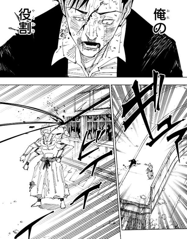 一方の日車はここで死ぬべきと虎杖言った言葉を思い出しながら、自分の役割を考えていました。その時、どこからか脹相が穿血を宿儺に放ちます。前回、脹相は胸を宿儺の手刀で貫かれて生死不明でしたが、生きていて再び宿儺に攻撃を加えました。