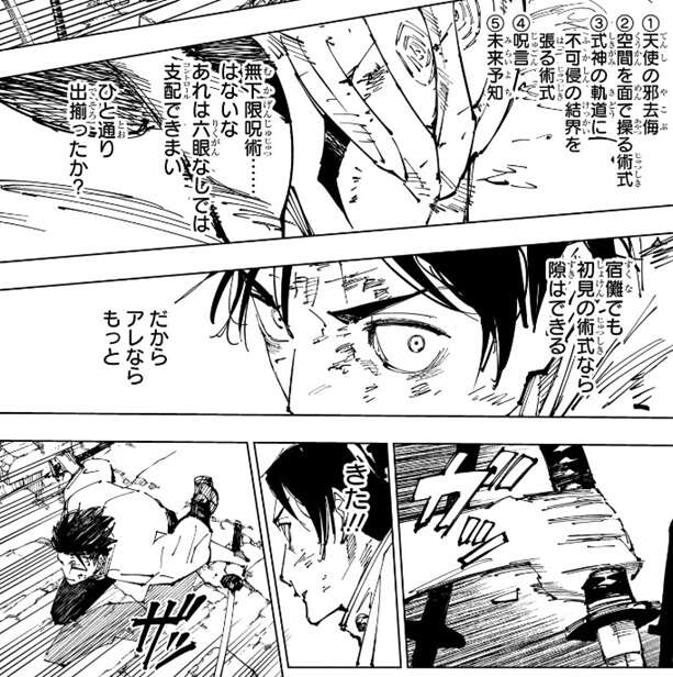 と宿儺は、今まで乙骨が模倣した術式を挙げた後、無下限呪術は六眼なしではコントロールできないだろうから、模倣は無いと予測します。そして、宿儺はひと通り出揃ったか?と、包蔵(ストック)した術式が出尽くしたと予測します。しかし乙骨は、宿儺でも初見の術式なら隙はできる、だからアレならもっと、と心の中でつぶやき引き当てたい術式がある事を示唆します。その後乙骨は刀を引き抜くと、引き当てたい術式が出たようで、きた!!と、心の中でつぶやきます。