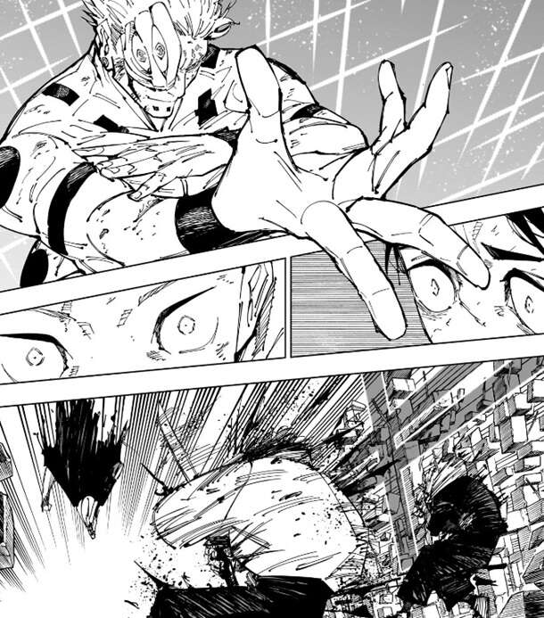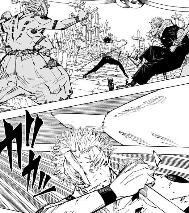 宇守羅彈で吹き飛ばされた宿儺にリカは両手で攻撃し、地面に宿儺を叩きつけます。さらに乙骨と虎杖が地面に叩きつけられた宿儺を追い、追い討ちをかけようとします。