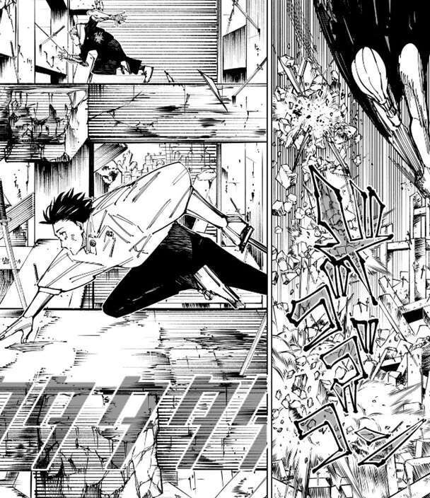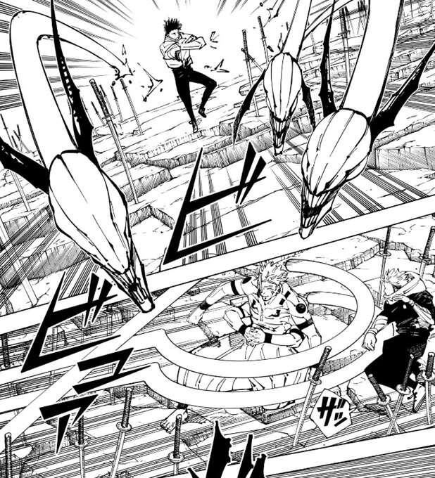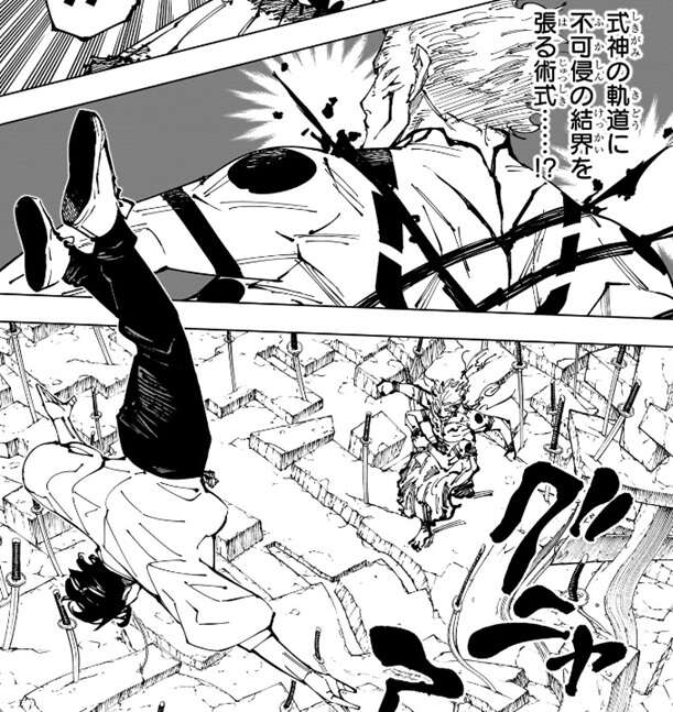 乙骨が呼び出した式神にはドルゥヴ・ラクダワラの術式が使われていたようで、宿儺は式神の軌跡に触れて負傷してしまいます。ドルゥヴ・ラクダワラの術式は、式神の軌道を自らの領域とし不可侵の結界を張る術式で、宿儺は不可侵の結界に触れたため負傷したようです。さらに乙骨は新たな刀を抜いたようで、再び烏鷺亨子の空間を面で操る術式を使い、空間を歪めて宿儺の目を攪乱しようとします。