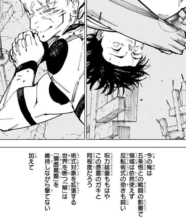 ここで宿儺の現状が明らかになります。今の宿儺は五条との戦闘の影響で、領域は依然使えず反転術式の効きもまだ鈍いようです。さらに呪力総量が減っていて、現在の宿儺の呪力総量は乙骨と同じ程度のようです。さらに、術式対象を拡張する世界を断つ「解」は「彌虚葛籠」を維持しながら撃つことは出来ないようです。