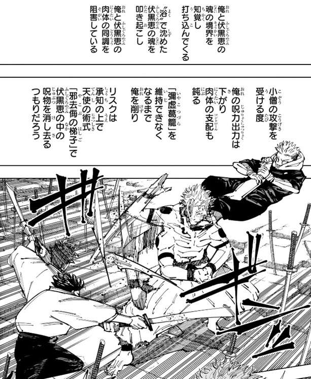 虎杖の攻撃は、宿儺と伏黒の魂の境界を知覚し打ち込んでくるようで、“浴”で沈めた伏黒の魂を叩き起こし、宿儺と伏黒の肉体の同調を阻害できるようです。これは虎杖が宿儺の魂を身体に宿していた事で、魂の輪郭を捉えることが出来るようになった為、今回も宿儺にこのような攻撃が出来たようです。宿儺は虎杖の攻撃を受ける度に、宿儺の呪力出力は下がり肉体のコントロールも鈍っていくようです。「彌虚葛籠」を維持できなくなるまで宿儺を削り、リスクは承知で邪去侮の梯子で伏黒の中の呪物を消し去るつもりだろう、と宿儺は虎杖と乙骨の作戦を推測します。虎杖と乙骨の同時攻撃を捌いた宿儺ですが、虎杖は宿儺の腕の一本を掴んで離そうとしません。そんな虎杖に宿儺はゼロ距離で斬撃を加えようとします。