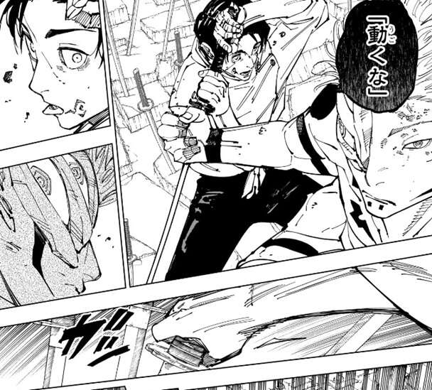 ここで乙骨は空間を面で操る術式を使いますが、この時乙骨は両手で二本の刀を持っています。二本の刀を持てば、二つの術式を連続使用する事も可能なようで、空間を歪めて宿儺に手元を見せないようにすると、乙骨は歪めた空間越しに刀を突き出します。宿儺は二本の腕で乙骨の刀を受け止めますが、乙骨は引き当てたかった術式を使用します。