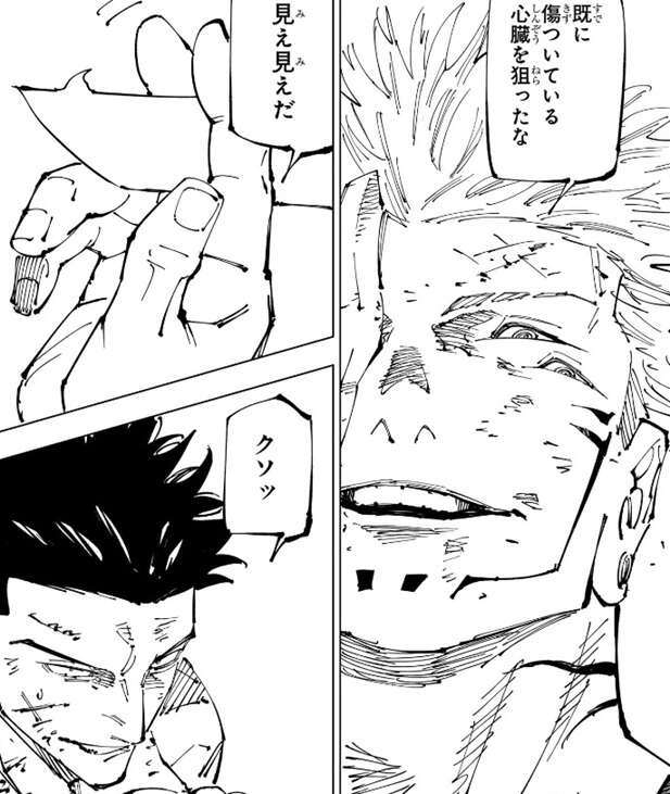 日下部は宿儺の傷ついている心臓を狙って、シン・陰流「朧月」という技を出します。折れた刀を使い、失った刀身は呪力で補って宿儺に攻撃します。