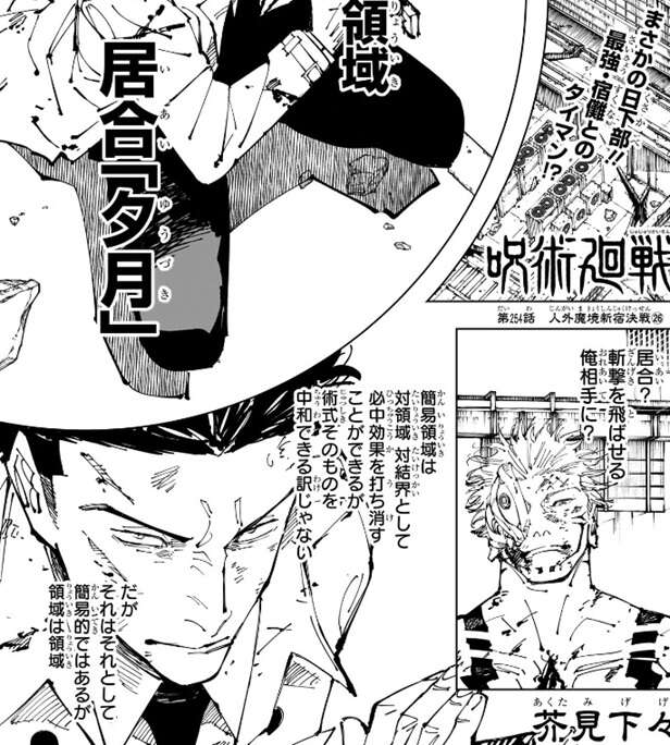 覚悟を決めた日下部はシン・陰流 簡易領域を展開、さらに居合「夕月」で居合の構えをとります。宿儺は、居合?斬撃を飛ばせる俺相手に?と、驚いたようですが、日下部には考えがありました。