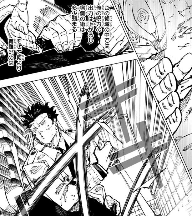 実際、宿儺を簡易領域の範囲内に引き込んだ後、日下部の居合がフルオート反射で宿儺を迎撃します。宿儺の体は日下部の居合で体全身を斬られて出血します。