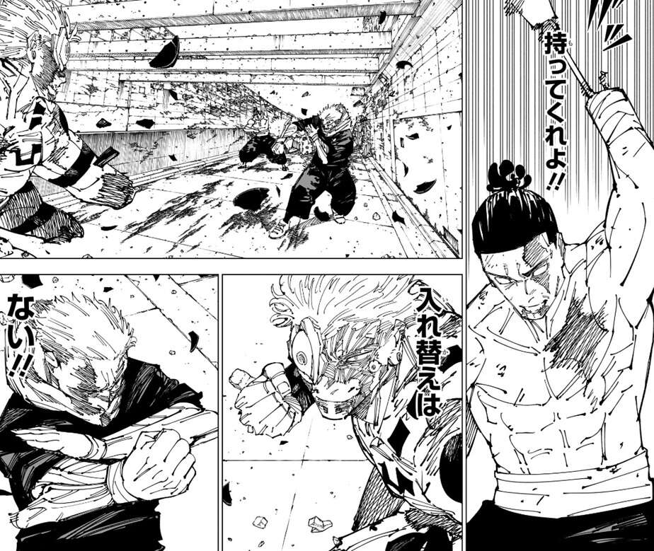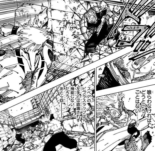 一方、スペアのビブラスラップは、もう左手とは認識されず機能しないだろうと東堂は考え、あと一回持ってくれよ!!と、心の中で祈るように叫ぶと、東堂はビブラスラップを鳴らします。宿儺はこの入れ替えはフェイントで、入れ替えはないと判断します。