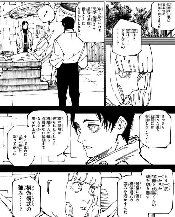 ここで新宿決戦前の回想に移り、乙骨が天使・来栖にお願いをしています。最後は君達に頼ることになるかもしれない、と乙骨は言い、乙骨の領域が破られたとしても来栖が戦う必要がない状態までなんとか場を仕上げるので、そこで止めに「邪去侮」を撃って欲しいとお願いします。「邪去侮」によってもう一度、一か八か宿儺と伏黒の魂を切り離そうという作戦です。そして、乙骨は模倣(コピー)術式の強みを話し始めます。