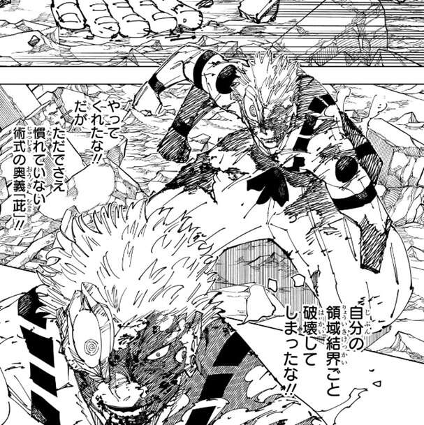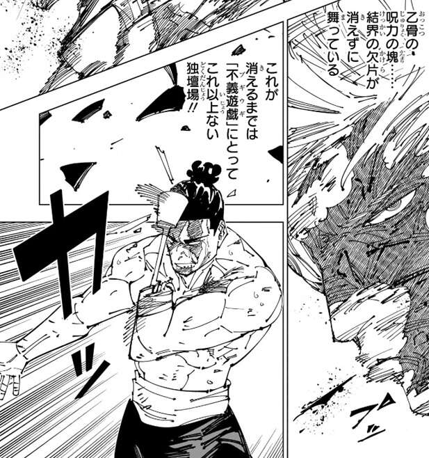 乙骨は虚式「茈」を宿儺に当てる事に成功しますが、乙骨が作った領域「小さい結界」も崩壊してしまいます。