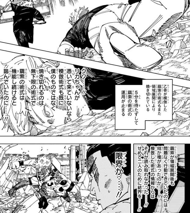 さらに乙骨も領域展開直後の術式使用困難の状態になりますが、ここで乙骨の予想に反して羂索の術式の運用が止まってしまいます。現在、五条乙骨にはリカが憑いていないので、模倣(コピー)術式も既に乙骨のものでないと予想し、焼き切れるのは無下限呪術の方だと乙骨は予想していましたが、予想に反して羂索の術式が焼き切れてしまいます。さらに羂索は九十九戦で領域展開後も問題なく行動できていたので、乙骨は羂索の術式が焼き切れても肉体は操れると思っていたようですが、実際には羂索が動けていたのには何か種があったようです。乙骨も模倣(コピー)した術式から情報を読み取っていたようですが、そこからは羂索の術式が焼き切れると肉体を操れなくなるという情報は読み取れなかったようで、乙骨は予想外の展開に困惑しつつもせめて二人のために結界を……、と考えます。