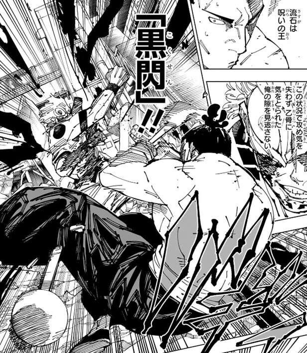 東堂が乙骨に気をつられている隙に、宿儺は東堂に攻撃しようとします。宿儺も「茈」をくらってかなりのダメージを負っていますが、攻め気を失わずさらに東堂に「黒閃」をきめます。東堂は「黒閃」をきめられて左手のビブラスラップが一部、破損します。
