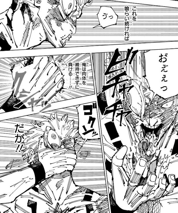 術式対象を絞る縛りをする事で、打撃よりも確実に魂を引き裂けるようです。効果はバツグンだったようで、虎杖の「解」をくらった宿儺は口から何かを吐き出してしまいます。何を吐き出したのかはっきりしませんが、おそらく伏黒恵に飲ませた呪物・宿儺の指だと思います。宿儺は吐き出してしまった指を再び飲み込みますが、このまま虎杖の「解」を喰らい続ければ肉体を維持できず負けると宿儺は直感します。