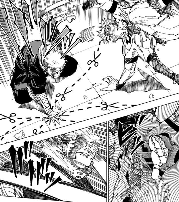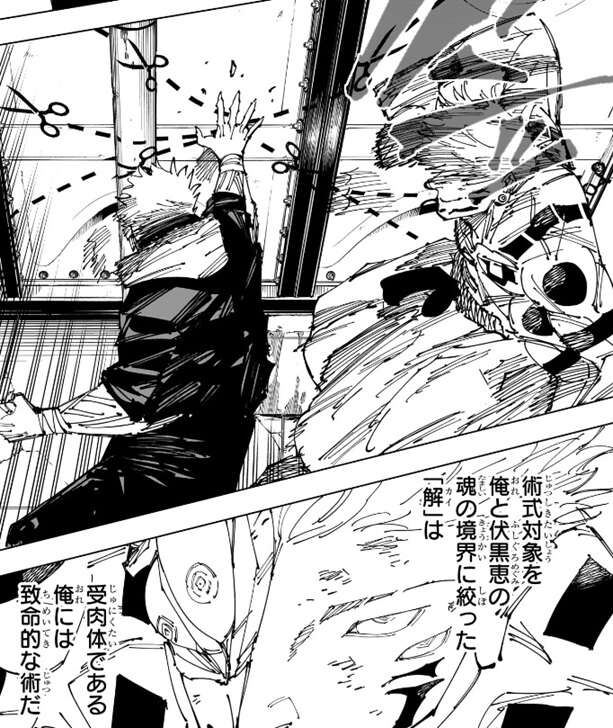 虎杖はまた地面に切り取り線の模様を出し、術式対象を魂の境界に絞った「解」で宿儺を攻撃しますが、宿儺はこの「解」をかわします。術式対象を宿儺と伏黒恵の魂の境界に絞った「解」は、受肉体である宿儺には致命的な術ですが、第263話と同様に当たらなければ意味はないと宿儺は判断し、さらに虎杖に打撃を入れます。